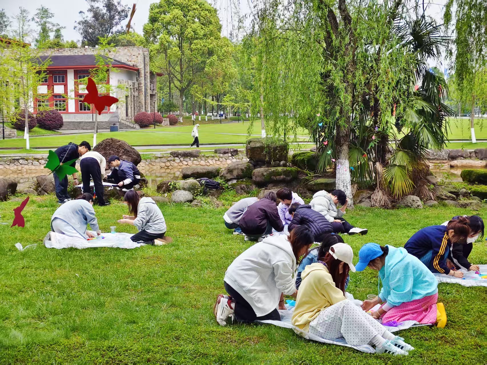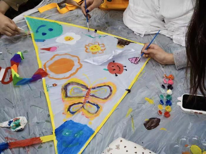 活动现场氛围热烈浓厚,从手绘创作到风筝放飞,每一个环节都洋溢着欢声笑语,尽显少年意气。春日午后的草地上,同学们围坐成圈,以空白风筝为画布,执画笔、蘸颜料,尽情挥洒创意与灵感。大家分工协作,调色盘里盛满明艳的色彩,画笔轻舞间,一个个独具特色的风筝逐渐成型,既传递着青春的创意与活力,也让团队协作的温暖在春日微风中悄然蔓延。